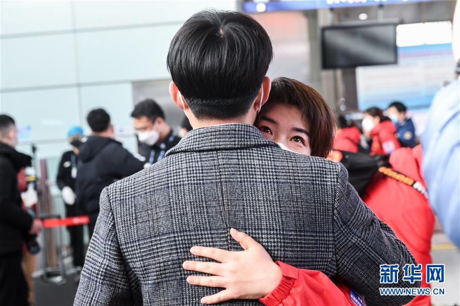 2月21日,在呼和浩特白塔机场,一名医疗队员(右)和亲人拥抱告别。 当日,由173人组成的内蒙古自治区第八批支援湖北医疗队从呼和浩特启程,驰援湖北。 新华社记者 刘磊 摄