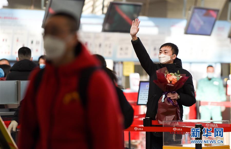 2月21日,在呼和浩特白塔机场,一位家属(右)挥手送别医疗队队员。 当日,由173人组成的内蒙古自治区第八批支援湖北医疗队从呼和浩特启程,驰援湖北。 新华社记者 连振 摄