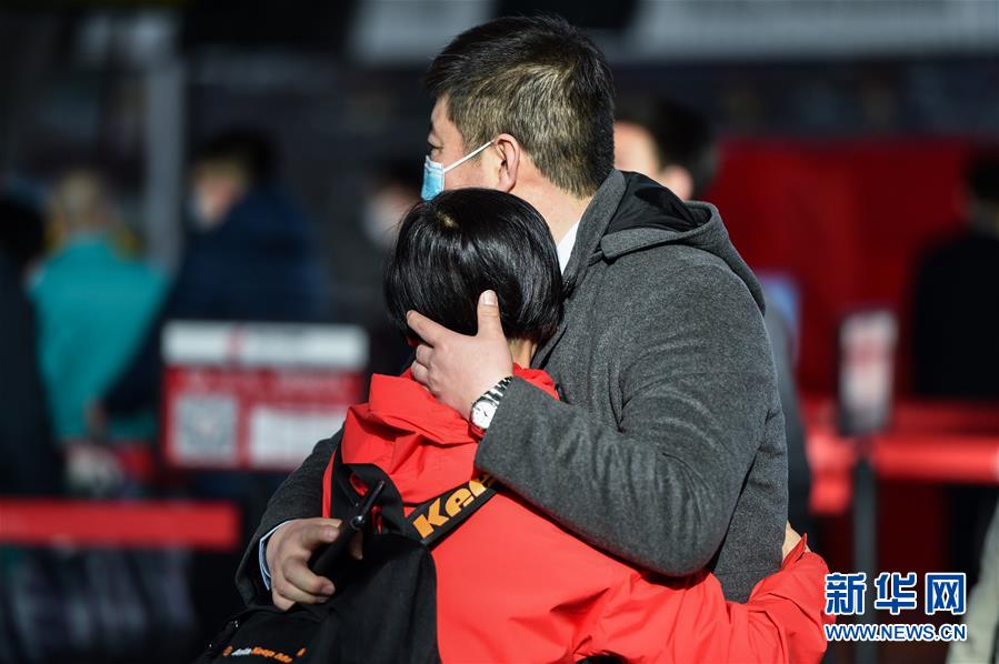 2月21日,在呼和浩特白塔机场,医疗队队员(左)和亲人拥抱告别。 当日,由173人组成的内蒙古自治区第八批支援湖北医疗队从呼和浩特启程,驰援湖北。 新华社记者 刘磊 摄