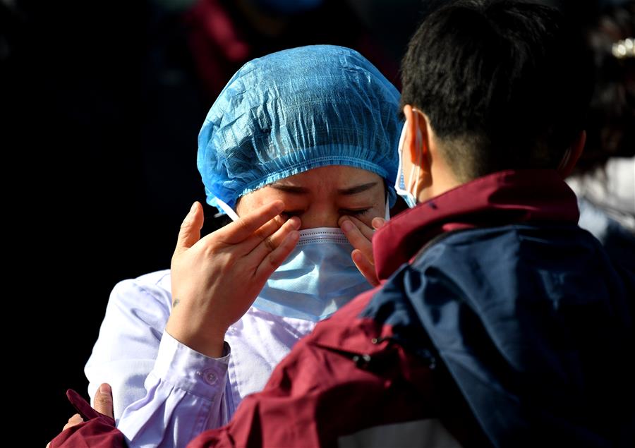 2月21日,陕西省中医医院一名护士与即将出发赶赴湖北的医疗队队员告别。 当日,陕西省第二批中医医疗队共35名医护人员启程前往湖北,医疗队队员分别来自陕西省中医医院、陕西中医药大学附属医院等4家三甲中医医院。 新华社记者 张博文 摄