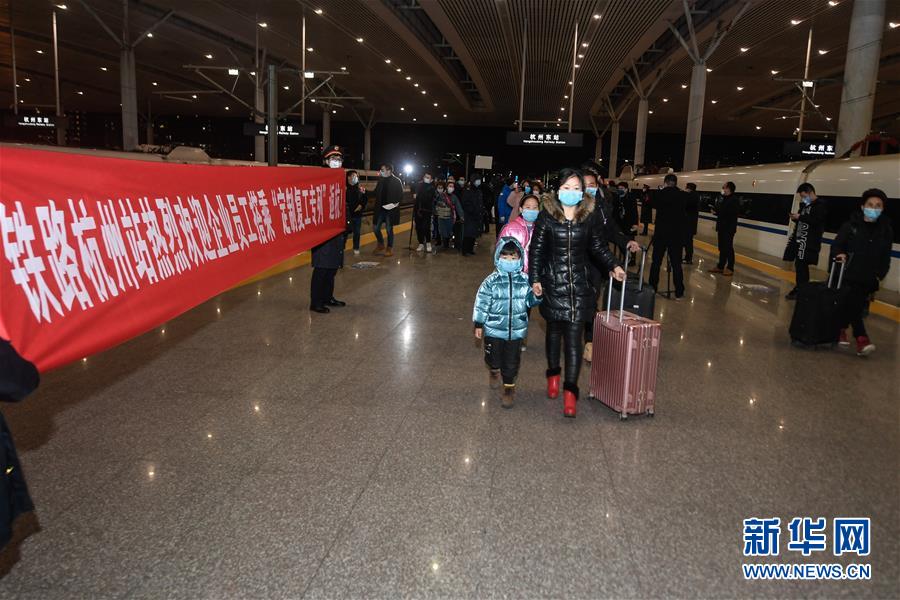 在杭州东站,从贵州乘坐外地复工人员专列抵达杭州的复工人员有序出站(2月16日摄)。 2月16日22时7分,载有近300名贵州籍旅客的G4138次列车到达杭州东站。这是铁路部门为服务企业外地员工返程而开行的首趟定制专列。 新华社记者 黄宗治 摄