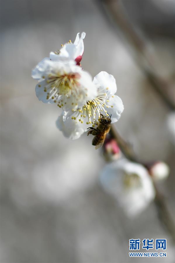 2月21日,在吴兴区妙西镇原乡小镇景区,一只蜜蜂在梅花丛中采蜜。新华社记者 黄宗治 摄