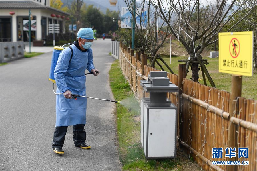 2月21日,在吴兴区妙西镇原乡小镇景区,工作人员在进行消杀作业。新华社记者 黄宗治 摄