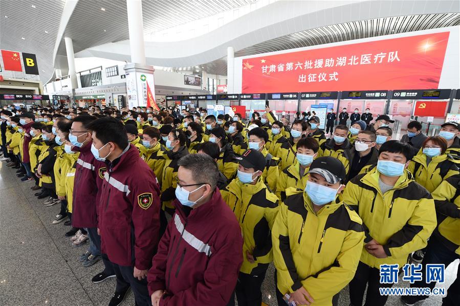 2月21日,甘肃省第六批援助湖北医疗队队员参加在兰州中川国际机场举行的出征仪式。 当日,由172人组成的甘肃省第六批援助湖北医疗队从兰州中川国际机场启程奔赴湖北。 新华社记者 范培珅 摄