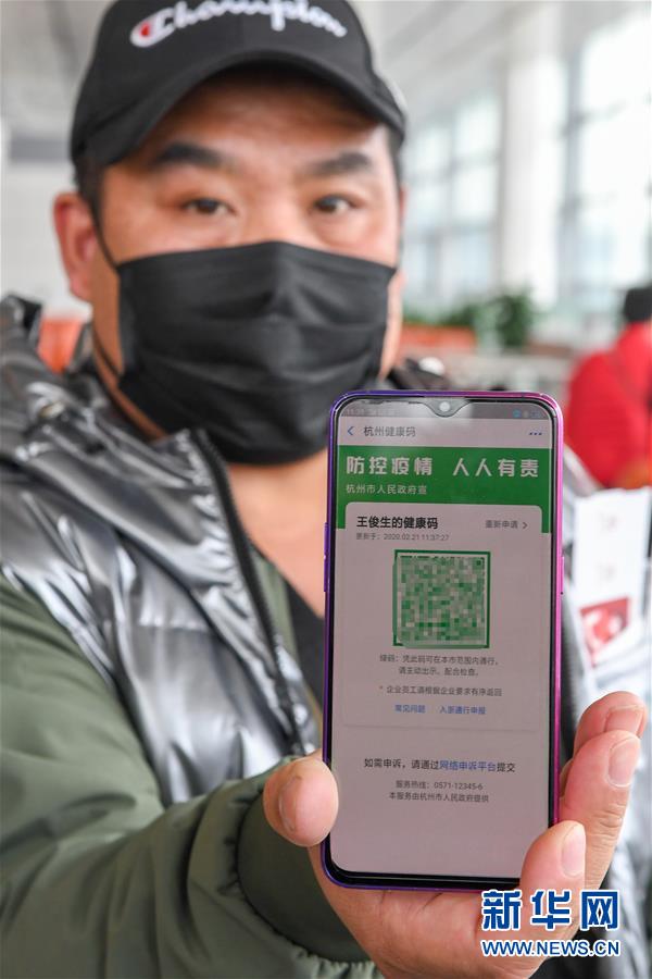 2月21日,在长春龙嘉国际机场,务工人员王俊生展示手机上的“健康码”。新华社记者 张楠 摄