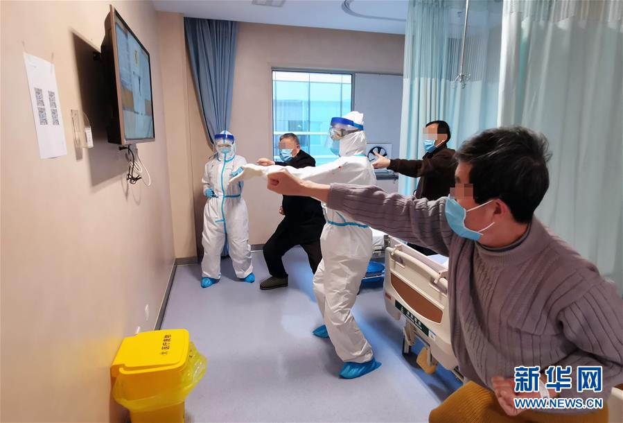 2月20日,在武汉同济医院光谷院区,青岛大学附属医院医疗队医护人员带领新冠肺炎患者练习八段锦。 驰援武汉抗击疫情的青岛大学附属医院医疗队接管了武汉同济医院光谷院区的一个新冠肺炎重症病区。为缓解患者的紧张情绪,丰富日常生活,提升自身抵抗力,医护人员们在保证日常治疗和护理的情况下,利用空余时间带领患者练习八段锦。 新华社发(青岛大学附属医院医疗队供图)