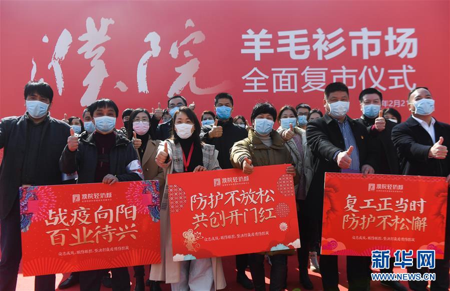 2月21日,濮院羊毛衫市场的商户在复市仪式上一起加油鼓劲。 当日,浙江省桐乡市濮院羊毛衫市场迎来农历新年后的全面复市,濮院羊毛衫市场下属的包括濮院时尚中心、国贸名品港、世贸大厦、国际时装城等在内的20个市场交易区重启线下交易,共有3000多经营户已经进场营业。 从2月15日开始,濮院羊毛衫市场就已实现“线上复市”,开辟网上市场空间,带动企业复工复产。目前该市场通过平台直播、电商平台、自有平台等线上交易模式,已达成总成交额1.3亿元人民币。按照防疫要求,濮院市场细化为20个闭环管理区块,在各个出入口设立了检查点,对进入市场的经营户、采购商及市场从业人员进行体温测量,落实各项疫情防控措施。 新华社记者 徐昱 摄