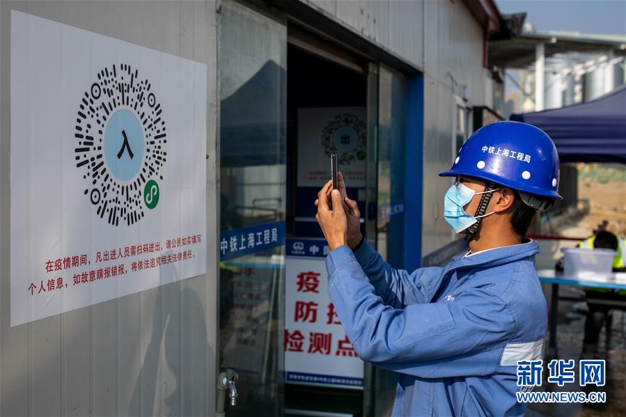 2月21日,一名工人在进入工地前扫描“云南抗疫情”二维码。 近日,昆明轨道交通4号线广卫停车场项目工地开始复工建设。为做好新冠肺炎疫情防控,中铁上海局六公司在工地内采取定时测量体温、定时消毒、分散就餐、设置隔离观察区等方式,保障建设工作正常进行。 新华社记者胡超 摄