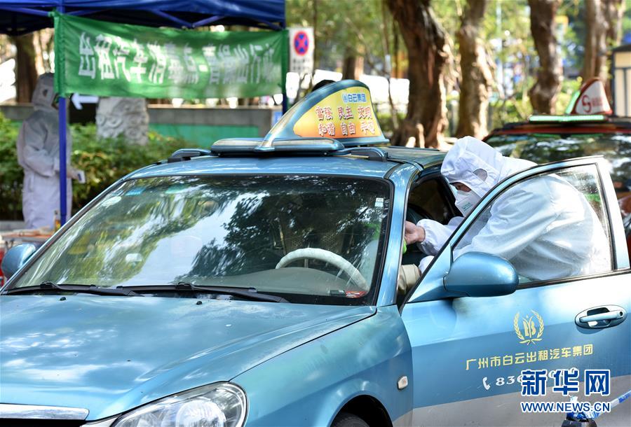 2月21日,广州交通运输部门服务人员在连新路集中消毒服务点为出租车消毒。新华社记者刘大伟摄