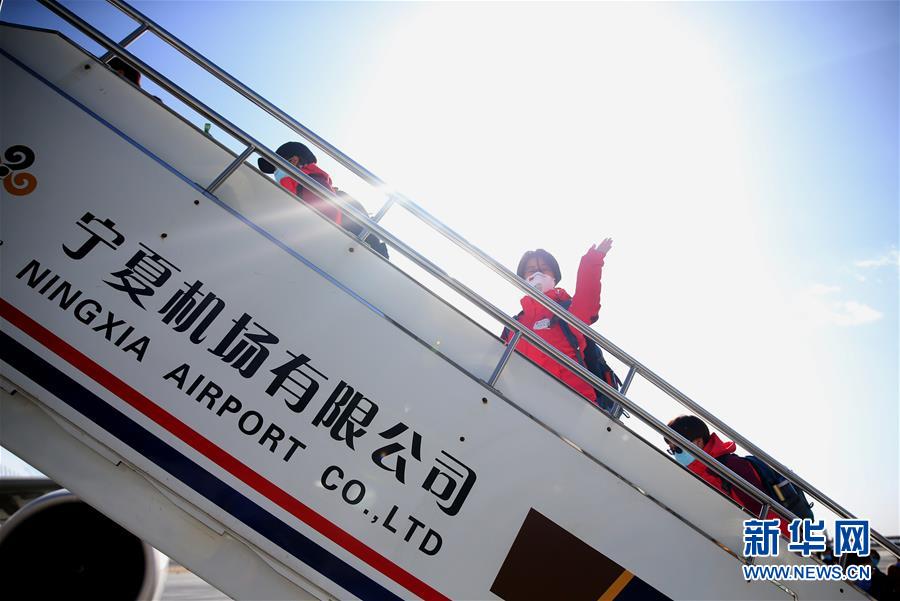 2月21日,在银川河东机场,医疗队员登机准备出发。 当日,宁夏第六批援助湖北医疗队从银川启程,飞赴武汉支援新冠肺炎疫情防控和救治工作。医疗队共172人,由宁夏医科大学总医院、自治区人民医院、自治区第五人民医院等单位共同派出。 新华社记者 贾浩成 摄