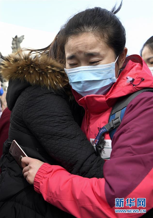 2月21日,在宁夏医科大学总医院,医疗队队员杨美霞在出发前与亲朋告别。 当日,宁夏第六批援助湖北医疗队从银川启程,飞赴武汉支援新冠肺炎疫情防控和救治工作。医疗队共172人,由宁夏医科大学总医院、自治区人民医院、自治区第五人民医院等单位共同派出。 新华社记者 冯开华 摄