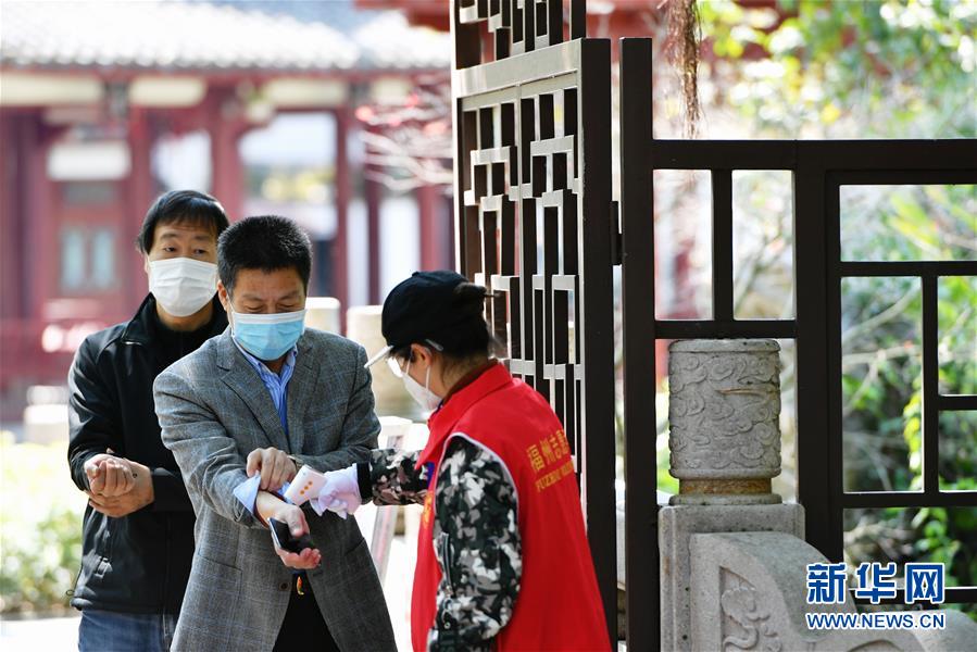 2月21日,志愿者给进入福州西湖公园的游客测量体温。 当日,福州市区西湖公园、金鸡山公园、金山公园、闽江公园等部分公园有限开放,市民在佩戴口罩和测量体温后可以入园休闲游览,感受明媚春光。 新华社记者 魏培全 摄