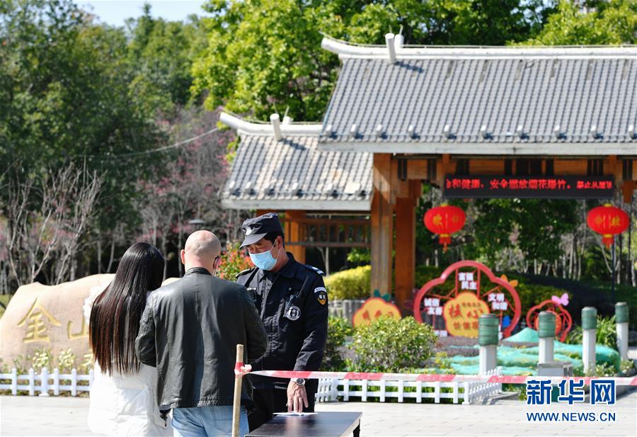 2月21日,在福州金山公园大门口,保安给两名游客测量体温。 当日,福州市区西湖公园、金鸡山公园、金山公园、闽江公园等部分公园有限开放,市民在佩戴口罩和测量体温后可以入园休闲游览,感受明媚春光。 新华社记者 魏培全 摄