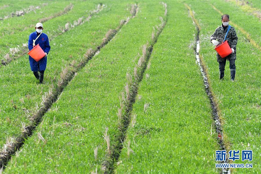 2月21日,安徽省肥西县丰乐镇河湾社区农民在田间为小麦施肥。 随着气温回暖,安徽各地农民紧抓农时开展春耕春管作业。 新华社记者 刘军喜 摄