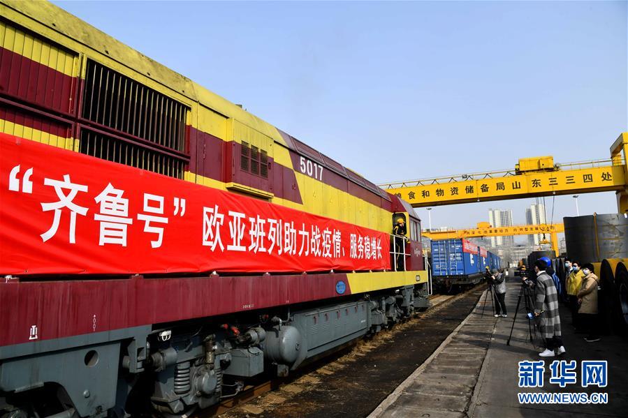 2月21日,在济南(国储)铁路国际站场,山东高速集团“齐鲁号”欧亚班列缓缓驶出站场。新华社记者 郭绪雷 摄
