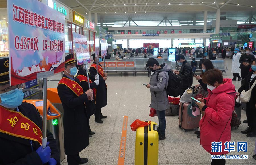 2月21日,外出务工乘客在南昌西站排队准备上车。新华社记者 万象 摄