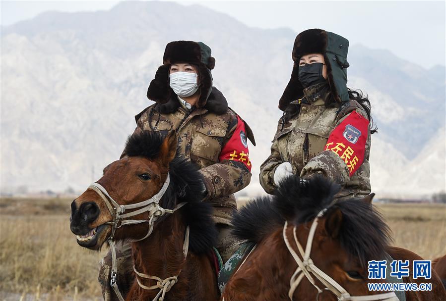 2月21日,内蒙古呼和浩特市土默特左旗敕勒川镇三卜树村疫情防控巡逻马队的女队员张宇霞(右)和郝丽娟在马背上瞭望观察。新华社记者 彭源 摄