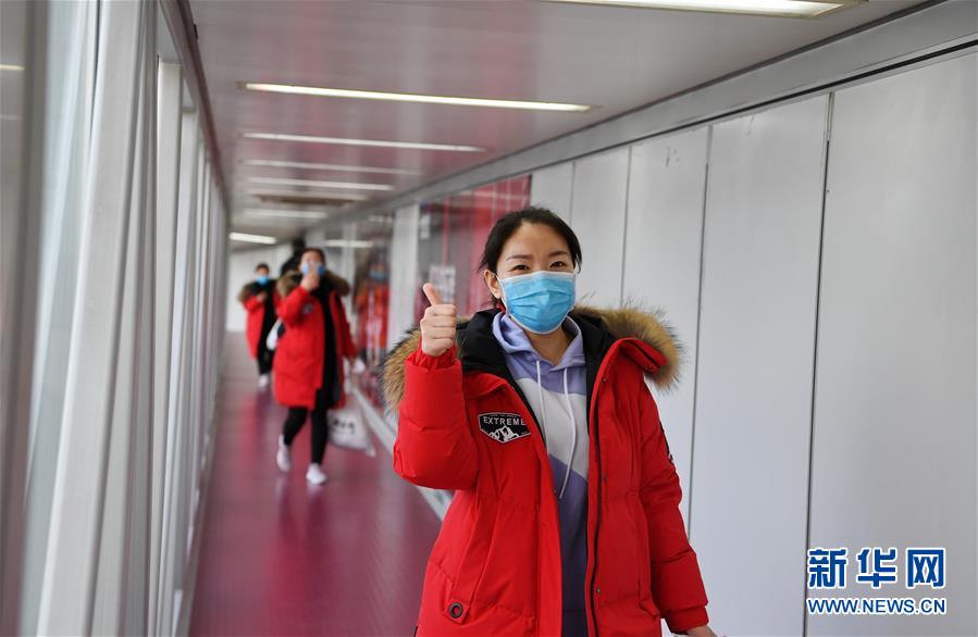 2月21日,河北省第八批支援湖北医疗队队员在登机途中为自己加油鼓劲。新华社记者 牟宇 摄