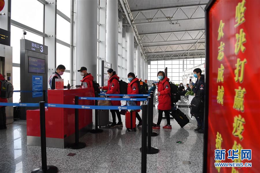 2月21日,河北省第八批支援湖北医疗队队员在正定国际机场检票登机。新华社记者 牟宇 摄