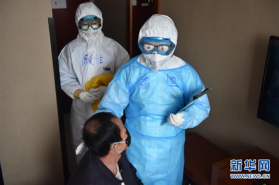 2月21日,医生潘恒(右)和护士陈曼怡对曾为雷神山医院建设工人的一名留观人员进行随访。新华社发(陈钟昊 摄)
