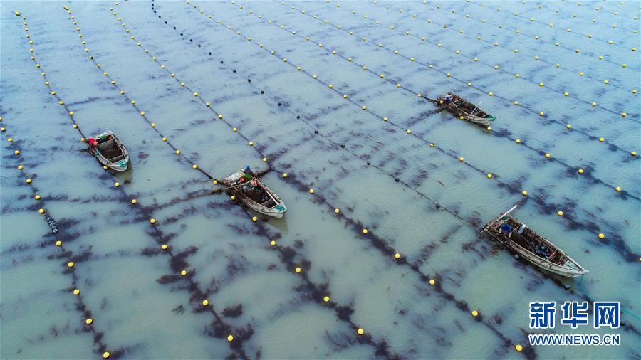 2月21日,在山东省荣成市俚岛镇的海带养殖区,养殖工人在海上劳作(无人机照片)。新华社发(李信君 摄)