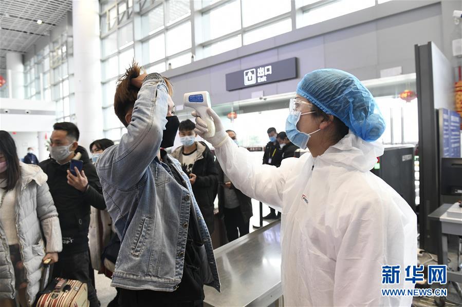 2月21日,在贵州省黔西南布依族苗族自治州兴义万峰林机场,医务人员为外出务工人员测量体温。 新华社发(刘朝富 摄)