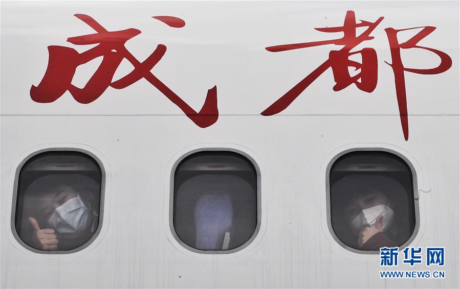 2月21日,四川省援助湖北联合医疗队的医护人员登机后向送行人员致意。新华社记者 刘坤 摄