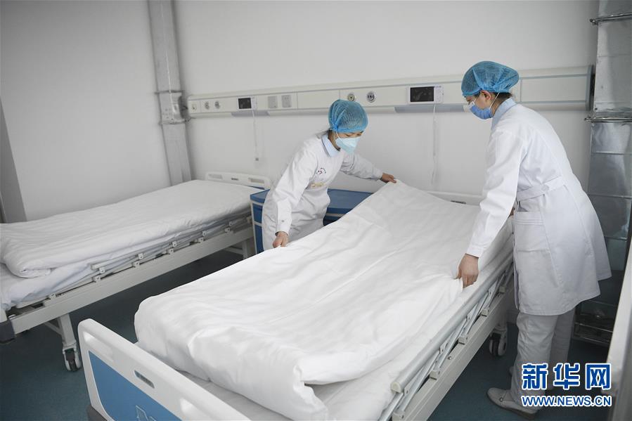 2月21日,两名护士在宁夏第四人民医院传染病防治综合楼的隔离病房中整理床铺。新华社记者 王鹏 摄
