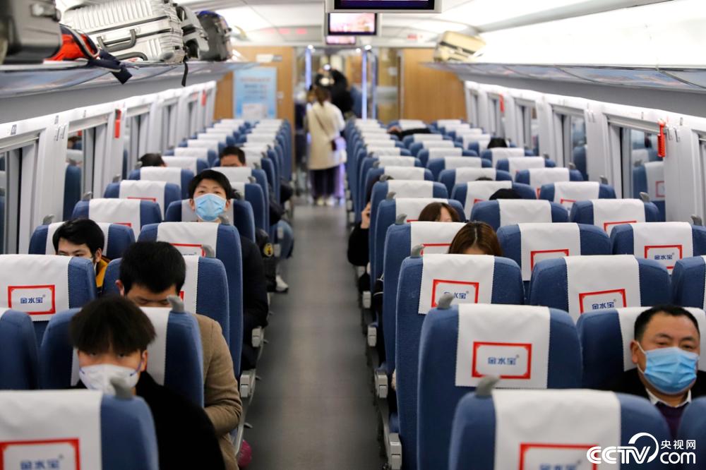 乘坐次复工专列的务工人员在车厢间隔就坐。