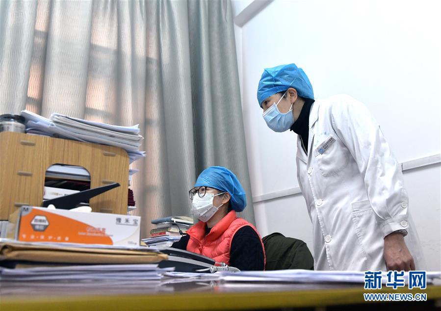 染病康复后第一天上班的护士蔡桃英(右)来到医院人事部门查看自己返岗后的任务(2月22日摄)。 近日,武汉市汉口医院在工作中感染新型冠状病毒的多名医护人员经过治疗康复后,主动返回各自岗位,继续与病魔战斗。据统计,该院已经有十余位康复的医护人员陆续返岗工作。 新华社记者李贺摄