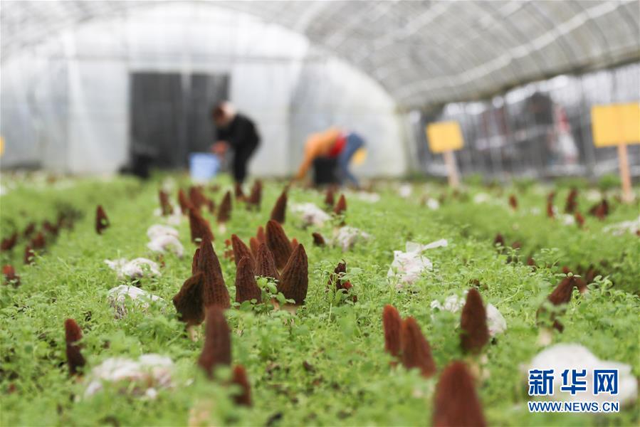 2月23日,在贵州省毕节市黔西县中建乡民主村,村民在大棚里采收羊肚菌。新华社发(韩贤普 摄)