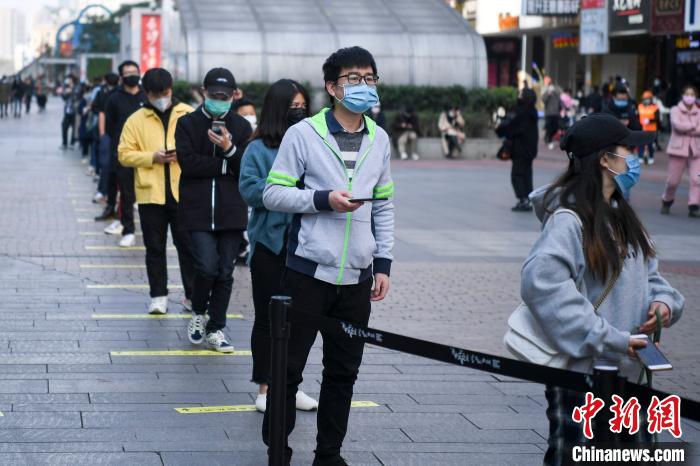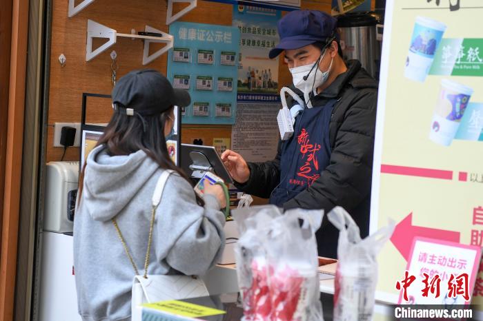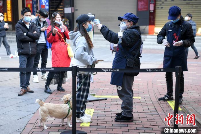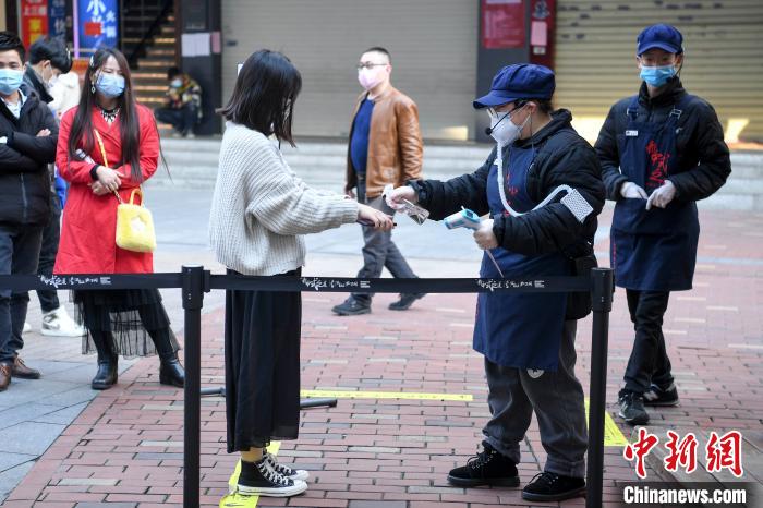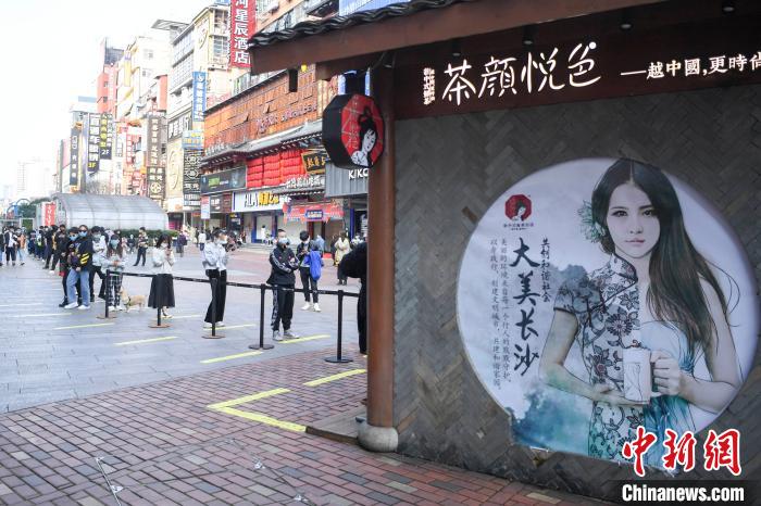 2月23日,位于长沙黄兴路的一家网红奶茶店已复工开业,顾客纷纷慕名而来,在奶茶店前排起近百米队伍。据现场店员介绍,排队顾客需每人间隔1.5米,店内点单和取餐的顾客都需要进行体温测量和手部消毒。