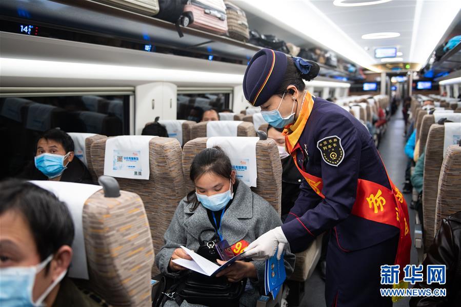 2月24日,在G9628次专列上,列车工作人员为返岗复工人员提供答疑服务。 当日,湖南定制返岗专列从娄底南站出发,456名务工人员搭乘G9628次定制专列前往珠三角地区返岗复工。这趟复工专列由湖南省双峰县人民政府定制,从娄底南站出发开往广州南站,到达广州南站后,将有大巴车将复工人员送至佛山、肇庆、深圳、东莞、惠州、珠海、中山、江门等八个城市。 新华社发(陈思汗摄)