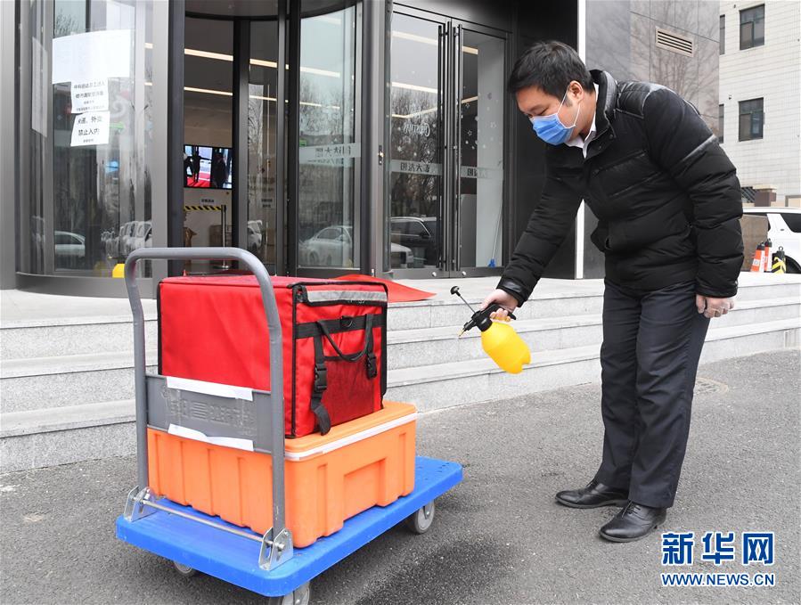 2月24日,创达大厦的物业人员对前一个工作日用来装午餐的保温箱进行消毒,准备送回中国农业大学。新华社记者 任超 摄