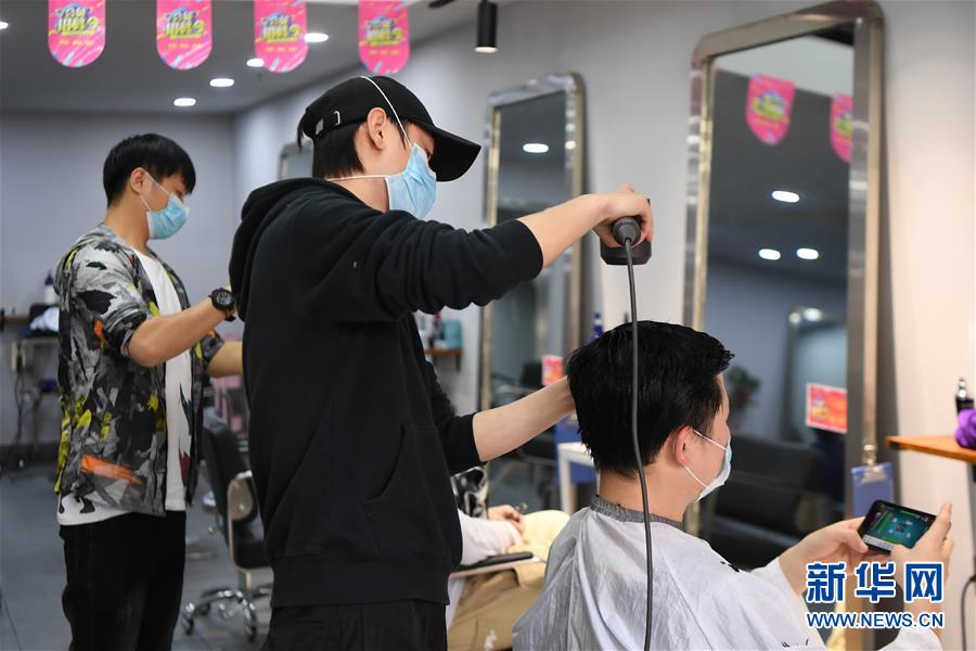 2月24日,在长沙一理发店内,理发师戴着口罩为顾客理发。新华社记者 薛宇舸 摄