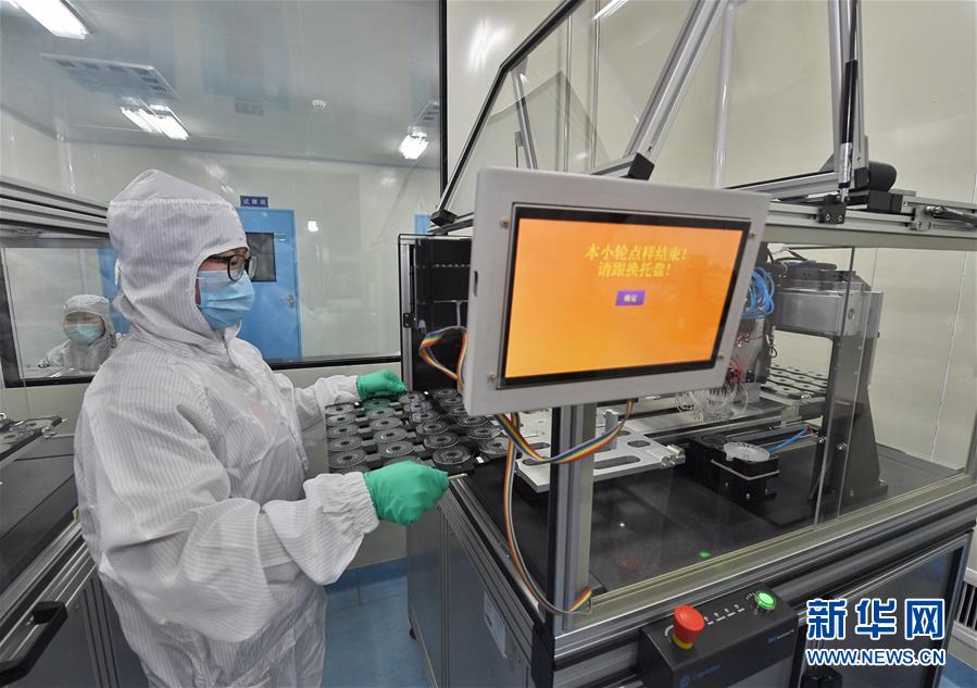 2月24日,成都博奥晶芯生物科技有限公司员工在试剂生产车间内生产呼吸道病毒核酸检测试剂盒。 近日,由四川大学华西医院联合成都博奥晶芯生物科技有限公司、清华大学共同设计开发的包括新冠肺炎病毒在内的“呼吸道病毒(6种)核酸检测试剂盒(恒温扩增芯片法)”获国家药监局第2批新型冠状病毒应急医疗器械审批批准(注册证证书号:国械注准20203400178),将迅速应用到疫情防控前线。 据了解,该检测产品是在国家卫健委高级别专家组组长钟南山院士、国家卫健委高级别专家李兰娟院士指导下设计开发的,只需采集患者的鼻、咽拭子等分泌物样本,在1.5小时内便可一次性检测包括新冠肺炎病毒在内的6种呼吸道病毒。 新华社记者 刘坤 摄