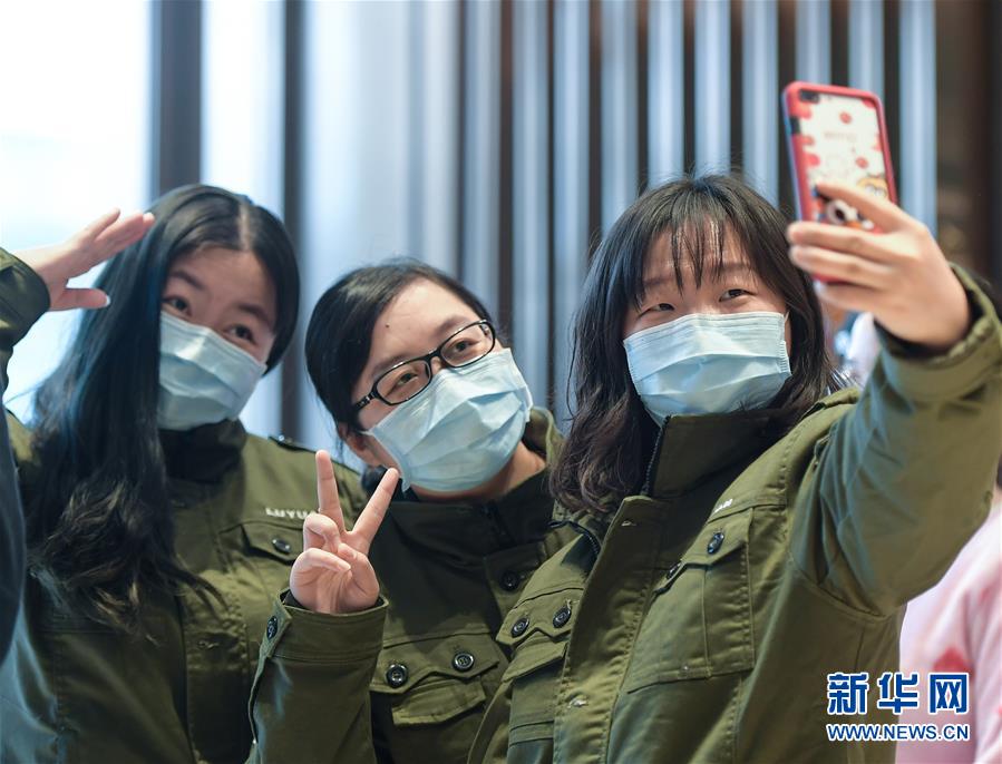 2月24日,在汉口医院医疗队驻地,几位医护人员在剪发前留影。当日是农历二月初二,5位发型师在汉口医院医疗队驻地为该院百余位战斗在“抗疫一线”的医护人员免费理发。 近期,由近百位发型师组成的志愿者团队在武汉为医护人员提供义务理发服务,据了解,该团队一周以来为近4000名医护人员义务理发。 新华社记者 李贺 摄