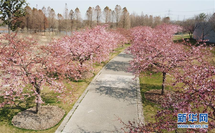 这是2月24日在上海松江辰山植物园内拍摄的樱花小径(无人机照片)。 近日,上海松江区辰山植物园内的河津樱绚丽绽放,花团锦簇间一派盎然春意。 新华社记者 方喆 摄