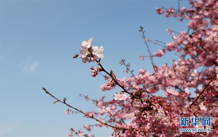 2月24日,在上海松江辰山植物园,蜜蜂在河津樱樱花丛中飞舞。 近日,上海松江区辰山植物园内的河津樱绚丽绽放,花团锦簇间一派盎然春意。 新华社记者 方喆 摄