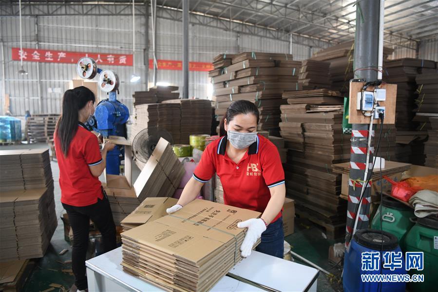 钦州市钦南区一家企业员工在车间生产防疫应急材料包装箱(2月22日摄)。 连日来,广西钦州市坚持“一手抓防疫不放松,一手抓经济不动摇”,在做好企业复工生产的同时,积极组织群众开展春耕春种,确保社会经济平稳发展。 新华社记者 张爱林 摄