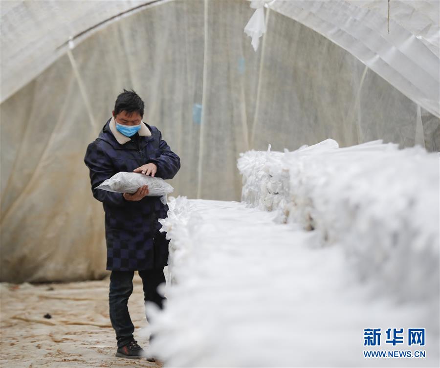 2月24日,技术人员在修齐镇花菇扶贫产业基地查看菌棒的发酵情况。 近日,重庆市城口县修齐镇花菇扶贫产业基地在做好疫情防控的同时开始逐步恢复生产。 新华社发(黄伟 摄)