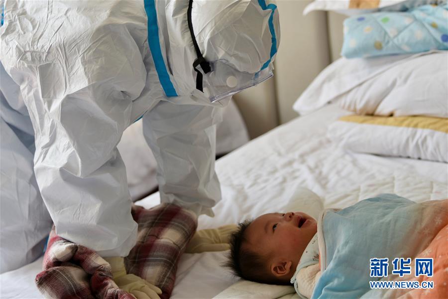 2月20日,在安庆市迎江区集中隔离点,赵蕊(化名)2个多月大的小宝醒来,看见身穿防护服“临时妈妈”王四妹。新华社记者 汤阳 摄