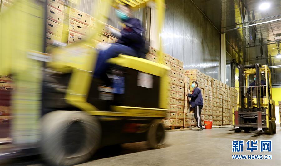 2月25日,在上海都乐公司,工作人员驾驶叉车行驶在厂区仓储区内。 位于上海浦东新区的上海都乐食品有限公司,在疫情防控期间全面提升了厂区卫生标准,加紧复工复产保障市场供应。 新华社记者 方喆 摄