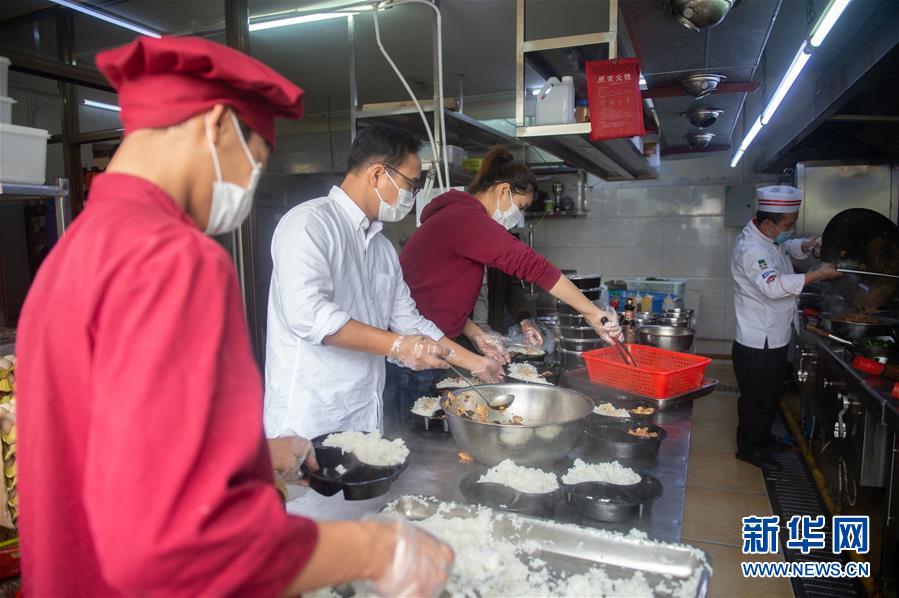 2月25日,餐厅工作人员准备要送的快餐。 王光华是海口一家餐厅的老板,在新冠肺炎疫情发生后,他看到很多一线的医护人员吃热饭菜有困难的消息,于是决定给海口市多家医院等免费送餐。自2月8日以来,王光华的餐厅已经给医护人员和社区防疫人员等送餐近2000份。 新华社发(张丽芸 摄)