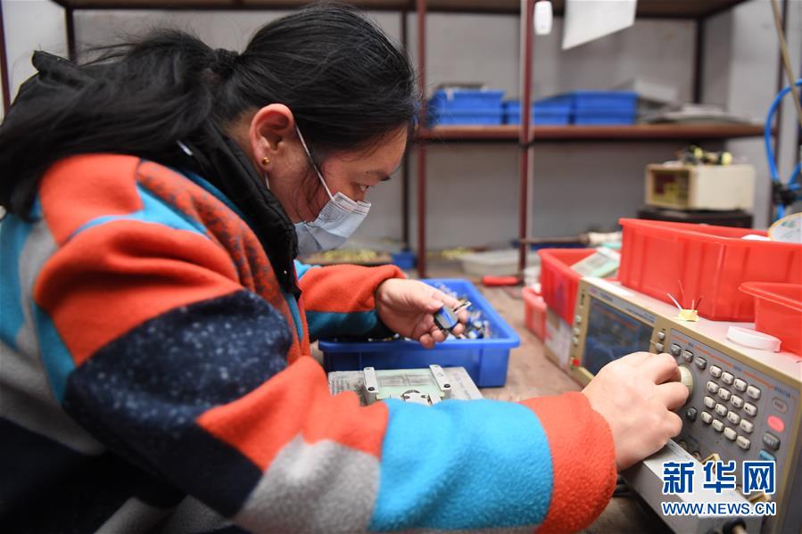 2月25日,在安化县江南镇骏嘉达电子有限公司扶贫车间,工人测试生产的高频变压器。 近日,湖南省益阳市安化县的31家扶贫车间在积极做好新冠肺炎疫情防控的同时,有序组织复产复工,已有共计370余人返回扶贫车间工作岗位,在保障市场需求的同时,确保贫困人口获得稳定收入。 新华社记者 薛宇舸 摄