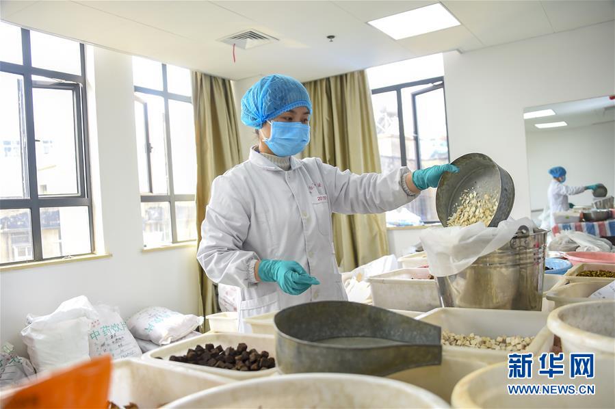 2月25日,湖北省孝感市中医医院药剂师周蕾在分拣用于制作汤剂的药材。 近期,湖北省孝感市中医医院加强中药汤剂的制作和供应,为全市多个区域提供针对新冠肺炎的中药汤剂,日均服务约5000人次。 新华社记者 胡虎虎 摄
