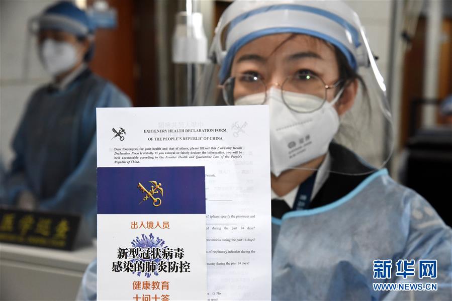 2月25日,青岛流亭国际机场海关人员向旅客示意填写《入境健康申明卡》。 连日来,山东青岛机场强化风险评估和口岸检疫,严格落实来青人员信息登记、体温检测和隔离留观等管控措施,主动做好外籍人员沟通解释和服务保障工作。据介绍,青岛市自2月24日开始,对所有入境人员,除需要隔离或留观的外,均由居住地所在区市派车接回。对在境内有居所的,居家隔离观察14天;对商务旅游等短期居住的,安排在指定宾馆住居、活动。 新华社记者 李紫恒 摄