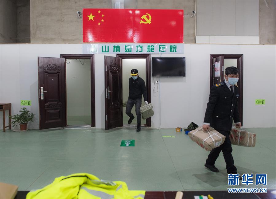 2月25日,在青山楠姆方舱医院,工作人员在现场忙碌。目前,武汉市青山楠姆方舱医院改造、准备工作已经初步完成,即将投入使用,可提供616张床位,收治新冠肺炎轻症患者。 新华社记者 肖艺九 摄