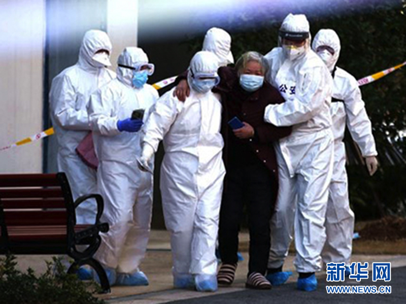武汉市东湖高新区的社区女民警史雪荣(右二)与医护人员一道,搀扶着一位老人走出隔离点(2月18日摄)。 新华社发