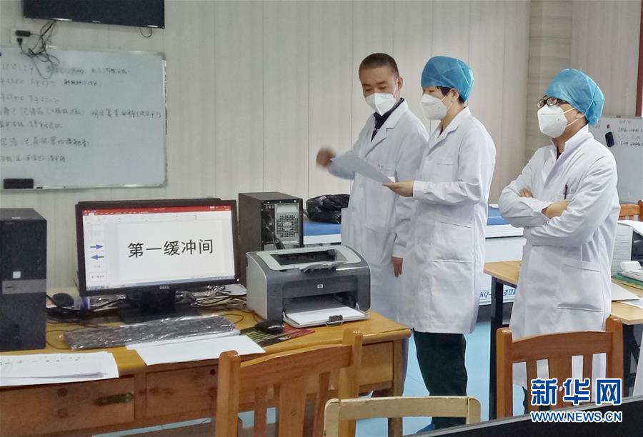 2月24日,中国医科大学附属第四医院医生胡巍娜(中)在枣阳中医院工作。新华社发(中国医科大学附属第四医院供图)